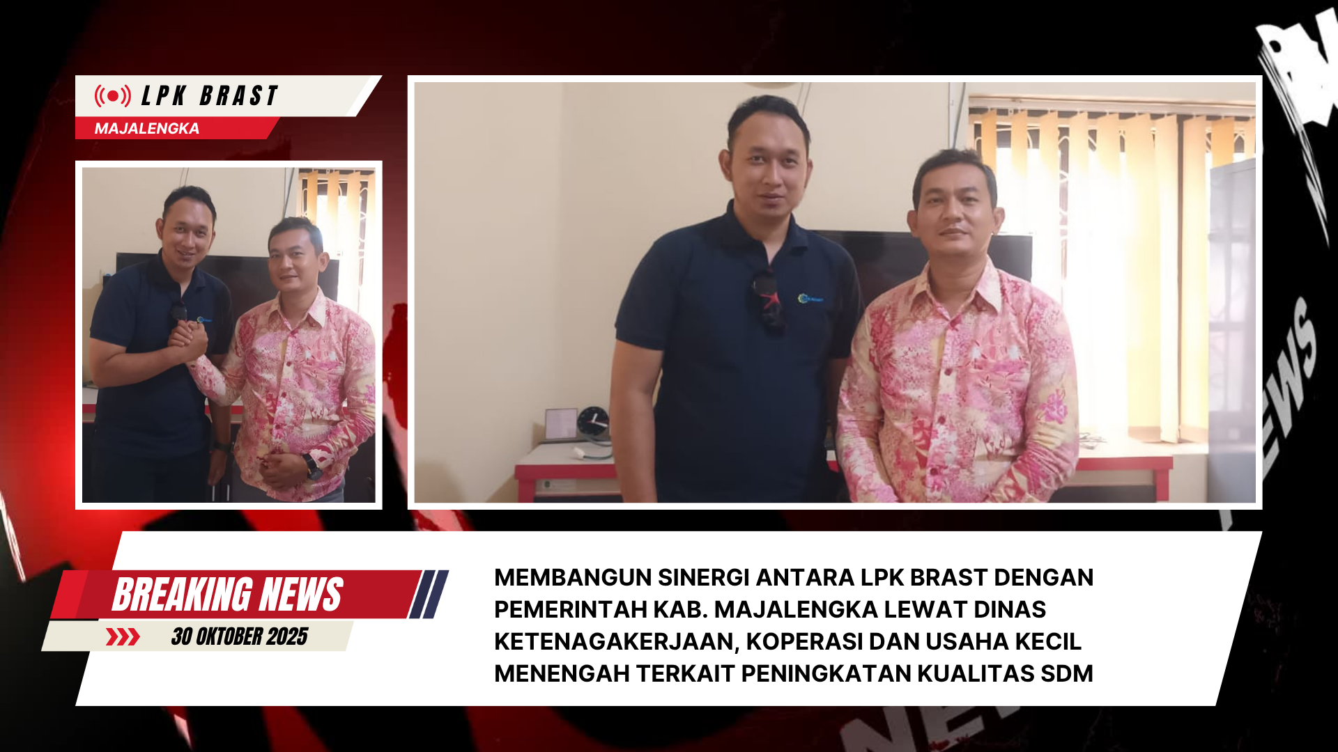 Pertemuan yang berfokus pada pembangunan sinergi peningkatan kualitas SDM ini melibatkan Direktur LPK BRAST, Sdr. Karim Pamela, dan Sekretaris Dinas, Bapak Adhi Setya Putra, S.E.